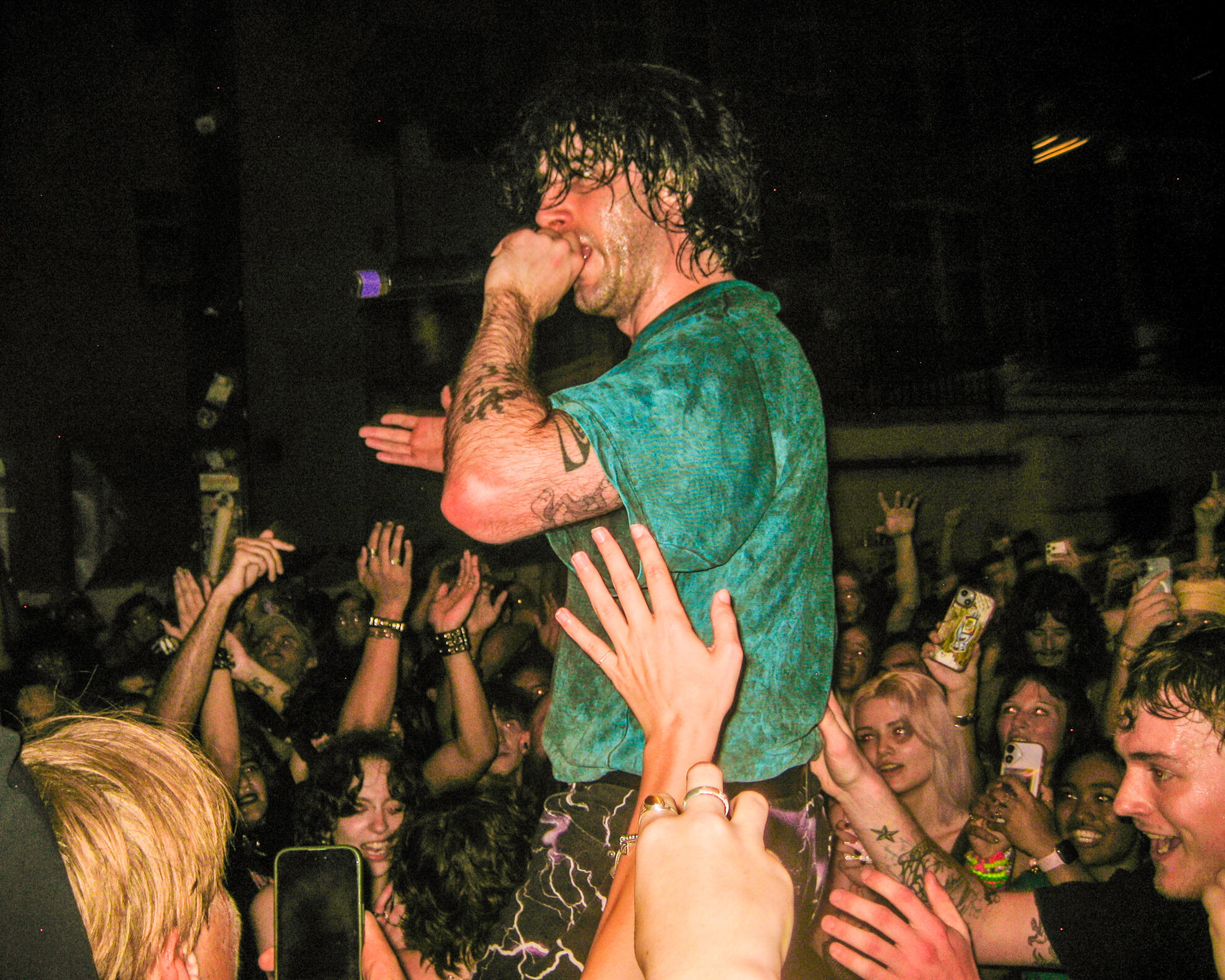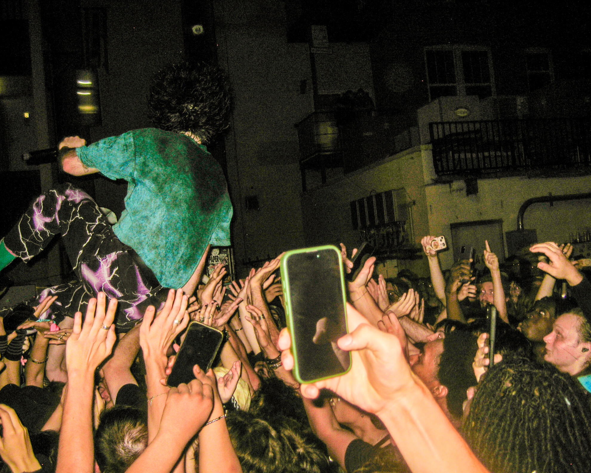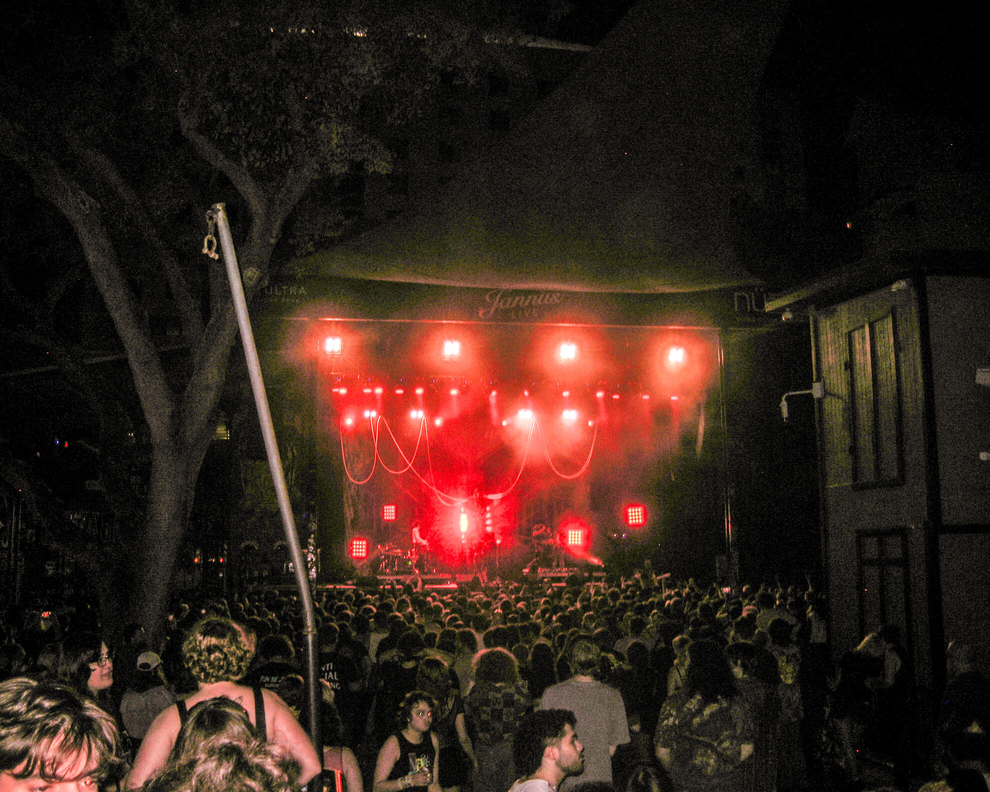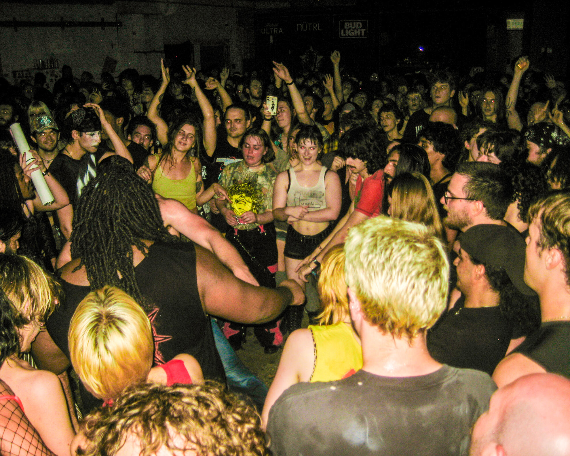 within seconds of the lead singer meandering onto the stage the crowd is hitting no less than 100 dB. i’d become a techno wavelength after just a strum of the sampler being fiddled. with the flip of a switch notice the crowd had made an opening for the pit, as i enter, a fleeting moment of the stage and the huge oak tree gawking over the crowd are blips in my memory. i was slammed, propelled towards the barricade along a lineup of women no taller than 5’1, a smart move only few will ever achieve. in between the rampant, saw cutting riffs and lightning-like drum machine i found solace in the sweaty folks around me. not a word coming out of anyone. not a fucking word. just pure energy and cigarettes. handshakes. hugs. smiles.