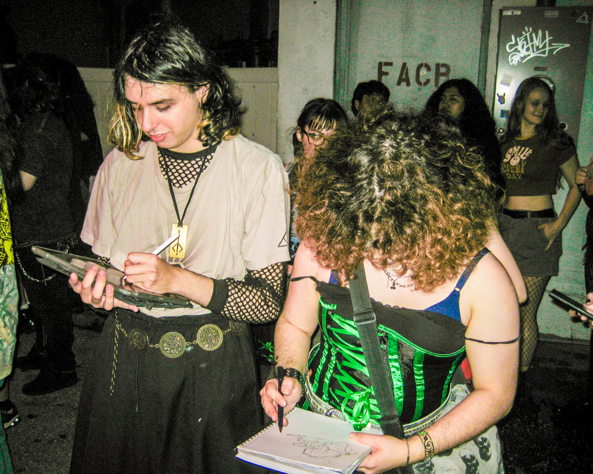 going over each opener would do them full justice in a short article but i’ll tell it to you like this: unexpected yet frivolously exciting and energetic. lustsickpuppy reminded me so much of rico nasty, it riled me up. all this gay energy had the sea of 500 people going berserk. on the other hand show me the body had a fuckin banjo and a synth sampler on stage for shits sake. the only song i knew was “metallic taste” which couldn't have been played in better fashion. the lead singer has a cool mc ride thing goin that he pulls off pretty well.before the machine girl set began i drew back into conversation with these art kids who’d been drawing in between sets. “i'm pretty bored so i oughta sketch” using a pencil to doodle her friend sitting on the ground. to my right someone asks about a tattoo on my neck “what does the target mean?”, “its a crosshair, i'm the target” i reply. she questions “does it have anything to do with charlie kirk?” — puzzled i look at her and can’t help but belt out laughter “no, i got this years ago. he stole my swag”. what kind of hooligan would get a tattoo in remembrance of charlie kirk and also attend a machine girl concert; the dichotomy baffled me.